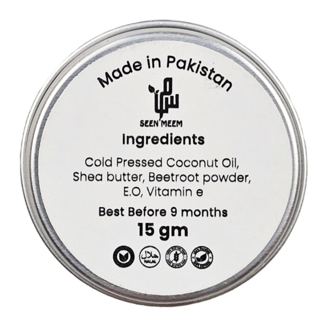 Cold pressed Coconut Oil, Shea Butter, Beetroot Powder, Essential Oils, Vitamin-E